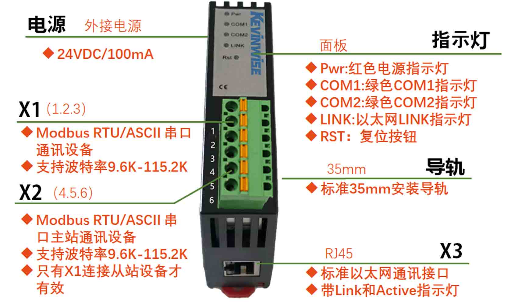 | 以太网口(X3) | IEEE 802.3兼容,Link/Active指示灯,线序自适应,支持Auto-MDIX | |